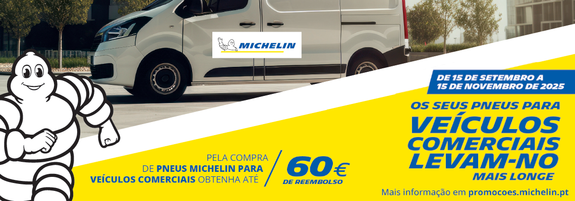 - Pela compra e montagem de 4 pneus MICHELIN para carrinhas (gama Agilis ou MICHELIN CrossClimate Camping) com jantes de 15" e superiores, o utilizador receberá da MICHELIN o valor de 60€, IVA incluído, que será pago por transferência bancária para reembolso em serviços.
